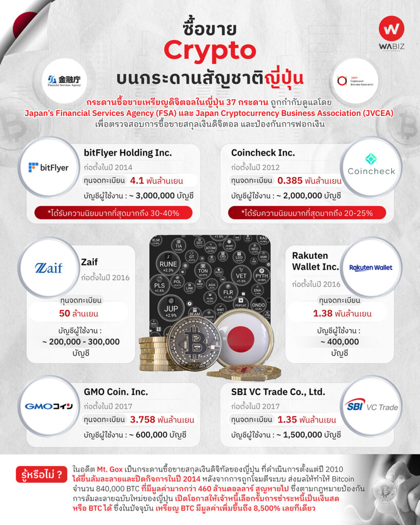 วันนี้ WABIZ จะพาทุกท่านมา เจาะลึกข้อมูลเกี่ยวกับแพลตฟอร์มการซื้อขายคริปโตเคอร์เรนซีในญี่ปุ่นที่ได้รับการอนุญาต พร้อมข้อมูลสำคัญ เช่น จำนวนผู้ใช้งาน กองทุนจดทะเบียน และรายละเอียดของแพลตฟอร์มที่ได้รับความนิยมที่สุดในประเทศ
