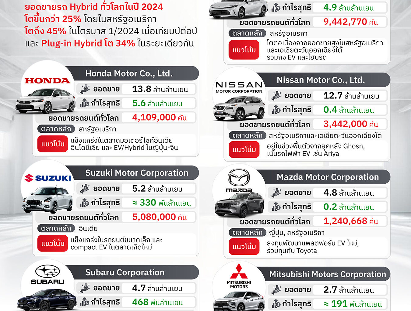 Mazda Motor Corporation มาสด้าลงทุนในไทยมากกว่า 5,000 ล้านบาท เพื่อสร้างฐานผลิต B-SUV Mild Hybrid กำลังการผลิตกว่า 100,000 คันต่อปี สำหรับส่งออกไปยังญี่ปุ่น อาเซียน และตลาดโลก การเคลื่อนไหวนี้สะท้อนความตั้งใจใช้ไทยเป็นฐานสำคัญในเครือข่ายการผลิตระดับโลก