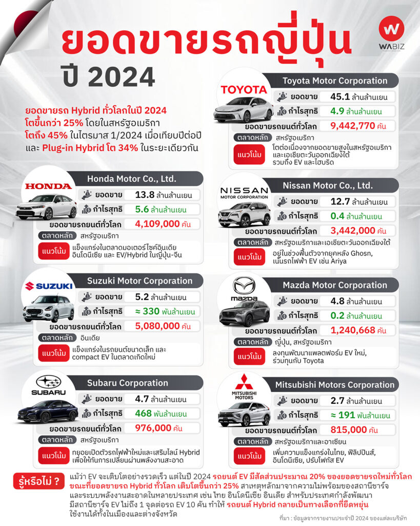 โดยแนวโน้มตลาดรถญี่ปุ่นในประเทศไทย 2025–2026 • รถญี่ปุ่นยังครองส่วนแบ่งตลาดไทยมากกว่า 80% • Hybrid และ PHEV จะเป็น “สะพานเชื่อม” สำคัญ ให้ผู้บริโภคเปลี่ยนจากเครื่องยนต์สันดาปไปสู่ EV • รัฐบาลไทยยังเดินหน้า นโยบายสนับสนุน EV ผ่านภาษีและเงินอุดหนุน → กดดันให้ค่ายญี่ปุ่นต้องเร่งออก EV ราคาที่แข่งขันได้กับจีน • การรุกของ EV จีน (BYD, MG, Neta ฯลฯ) จะเป็นปัจจัยเร่งให้ญี่ปุ่นต้องปรับตัวเร็วขึ้น โดยเฉพาะใน segment ราคากลาง–ล่าง
