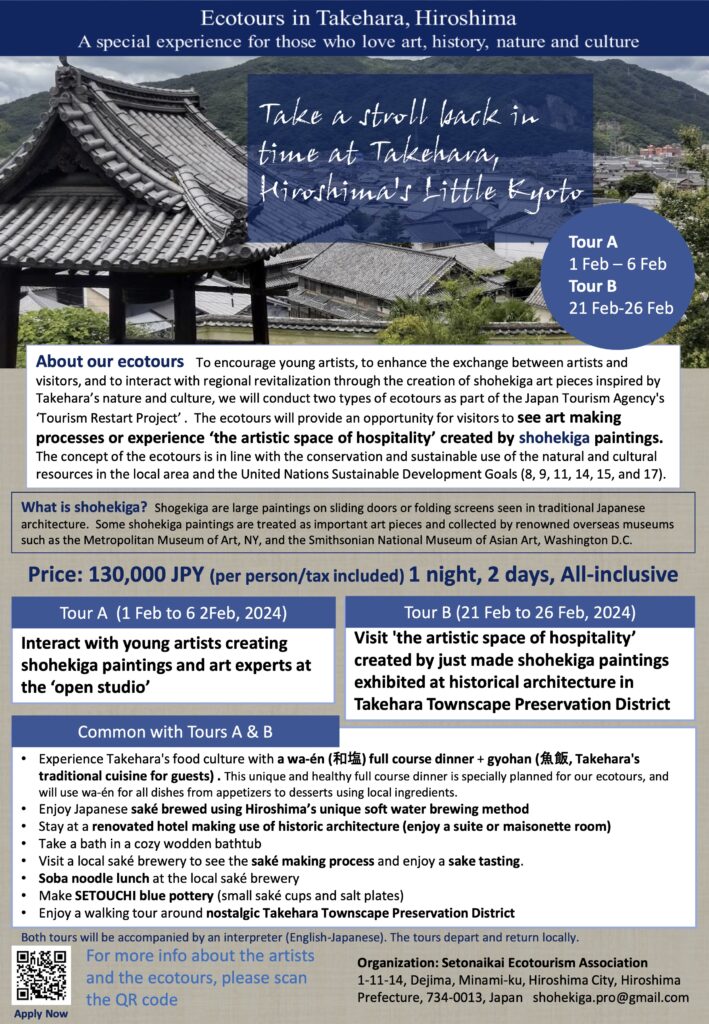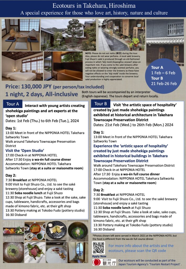 สำหรับผู้ที่รักในศิลปะ ประวัติศาสตร์ ธรรมชาติ และวัฒนธรรม สามารถเข้าร่วม “Ecotours” 2 วัน 1 คืน ซึ่งเป็นทัวร์ที่ถูกจัดขึ้นเพื่อส่งเสริมศิลปินรุ่นเยาว์ ส่งเสริมการแลกเปลี่ยนระหว่างศิลปินและผู้เยี่ยมชม และโต้ตอบกับการฟื้นฟูภูมิภาคผ่านการสร้างสรรค์ผลงานศิลปะโชเฮคิกะ* ที่ได้รับแรงบันดาลใจจากธรรมชาติและวัฒนธรรมของทาเคฮาระ