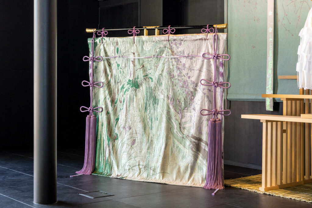 นอกจากนี้ ม่าน และ ฉากกั้น สำหรับศาลเจ้าชั่วคราวยังได้รับการตัดเย็บโดยแบรนด์ที่ได้เข้าร่วมในปารีสแฟชั่นวีค นั่นก็คือแบรนด์ Mame Kurogouchi ซึ่งเป็นแบรนด์แฟชั่นที่ได้รับการยอมรับระดับโลก การออกแบบนี้ได้รับแรงบันดาลใจจากการร้อยเรียงประวัติศาสตร์ของเทพเท็นจินและศาลเจ้า แสดงออกมาในรูปแบบของทิวทัศน์แห่งชีวิตที่โอบล้อมตัวศาลเจ้า ด้วยการใช้เทคนิคแบบดั้งเดิม ร่วมกับการใช้เครื่องทอผ้าสมัยใหม่