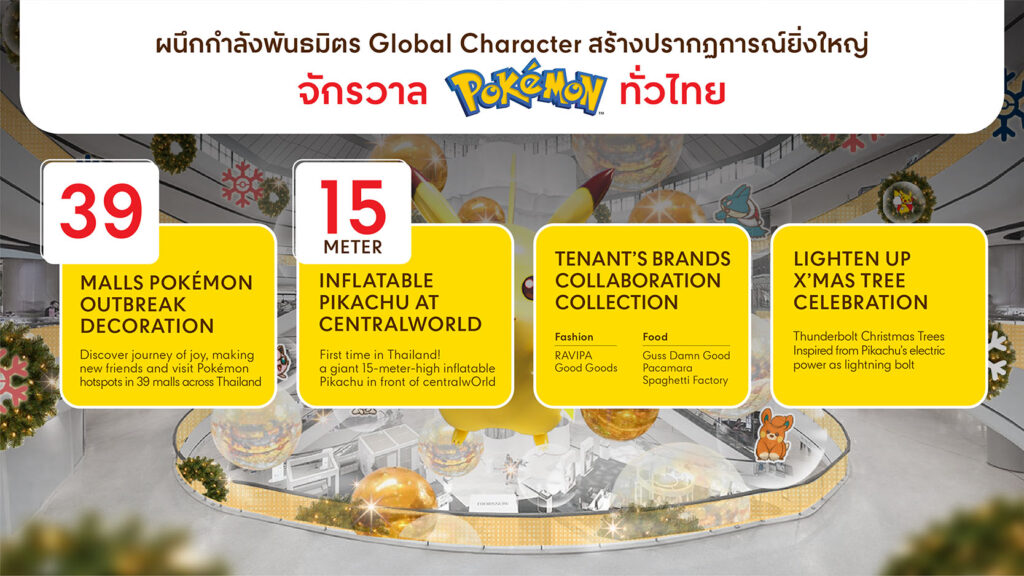 - Pokémon Collab Collection จากแบรนด์ชั้นนำในศูนย์การค้า อาทิ RAVIPA, goodgoods, GussDamnGood, Pacamara และ Spaghetti Factory