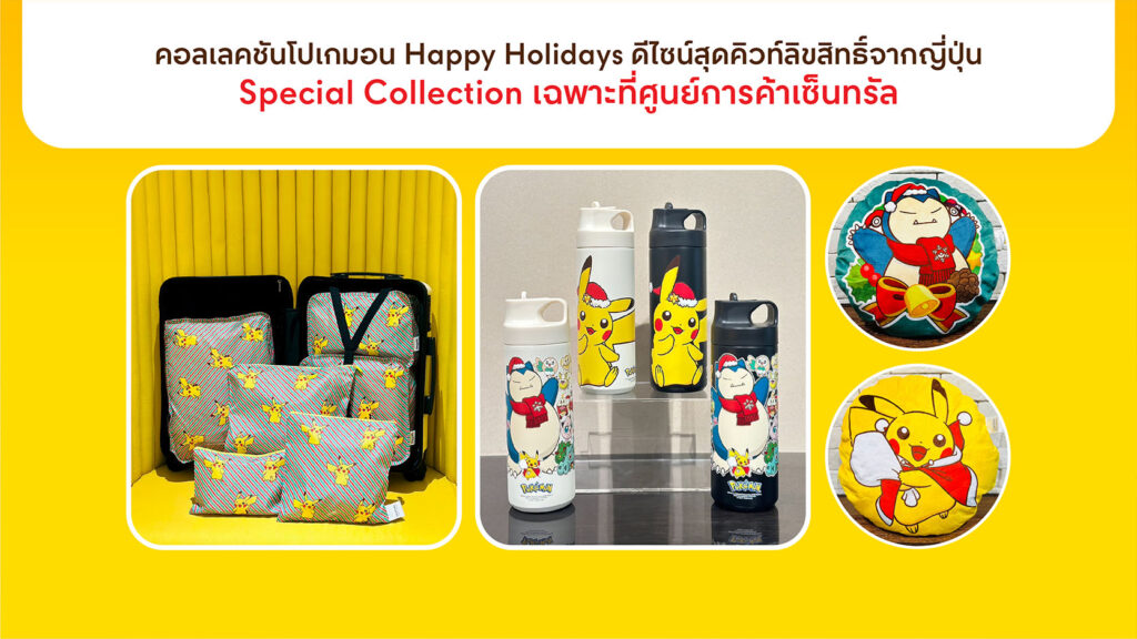 - นักสะสมห้ามพลาด! Pokémon คอลเลคชั่นพิเศษ Happy Holidays ดีไซน์สุดคิวท์ลิขสิทธิ์จากญี่ปุ่น Special collection เฉพาะเซ็นทรัลพัฒนา ได้แก่ 2-in-1 Pillow Blanket, Tumbler, Travel bag set, Keychain
