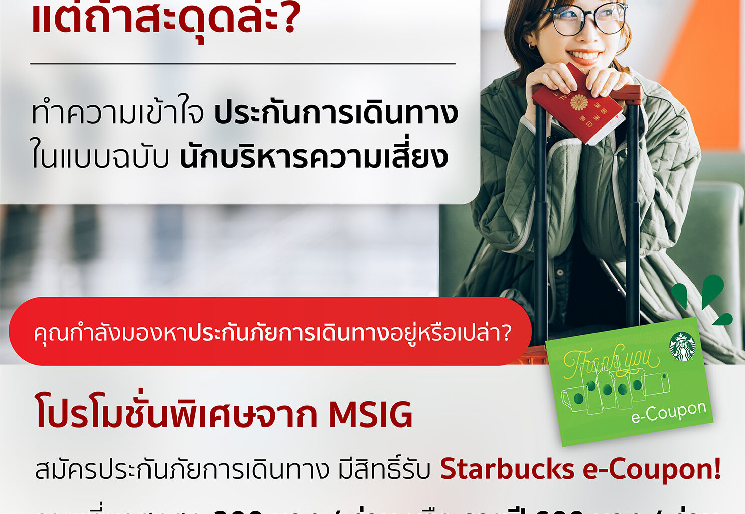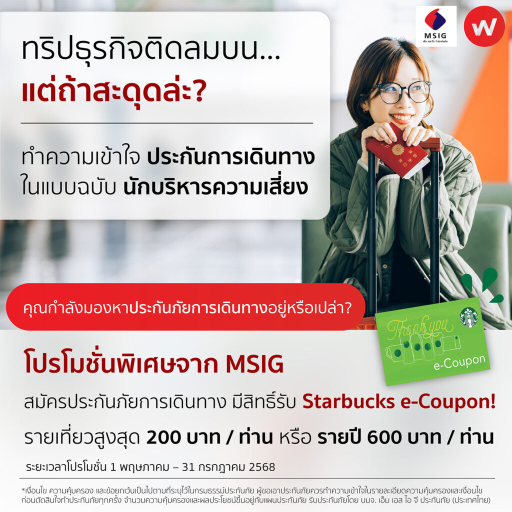 วางแผนการเดินทางธุรกิจครั้งต่อไปของคุณให้ไร้ความกังวลยิ่งขึ้น ศึกษาข้อมูลเพิ่มเติมเกี่ยวกับแผนประกันการเดินทาง MSIG ที่ออกแบบมาเพื่อคุณได้ที่: https://digital.msig-thai.com/wabizth