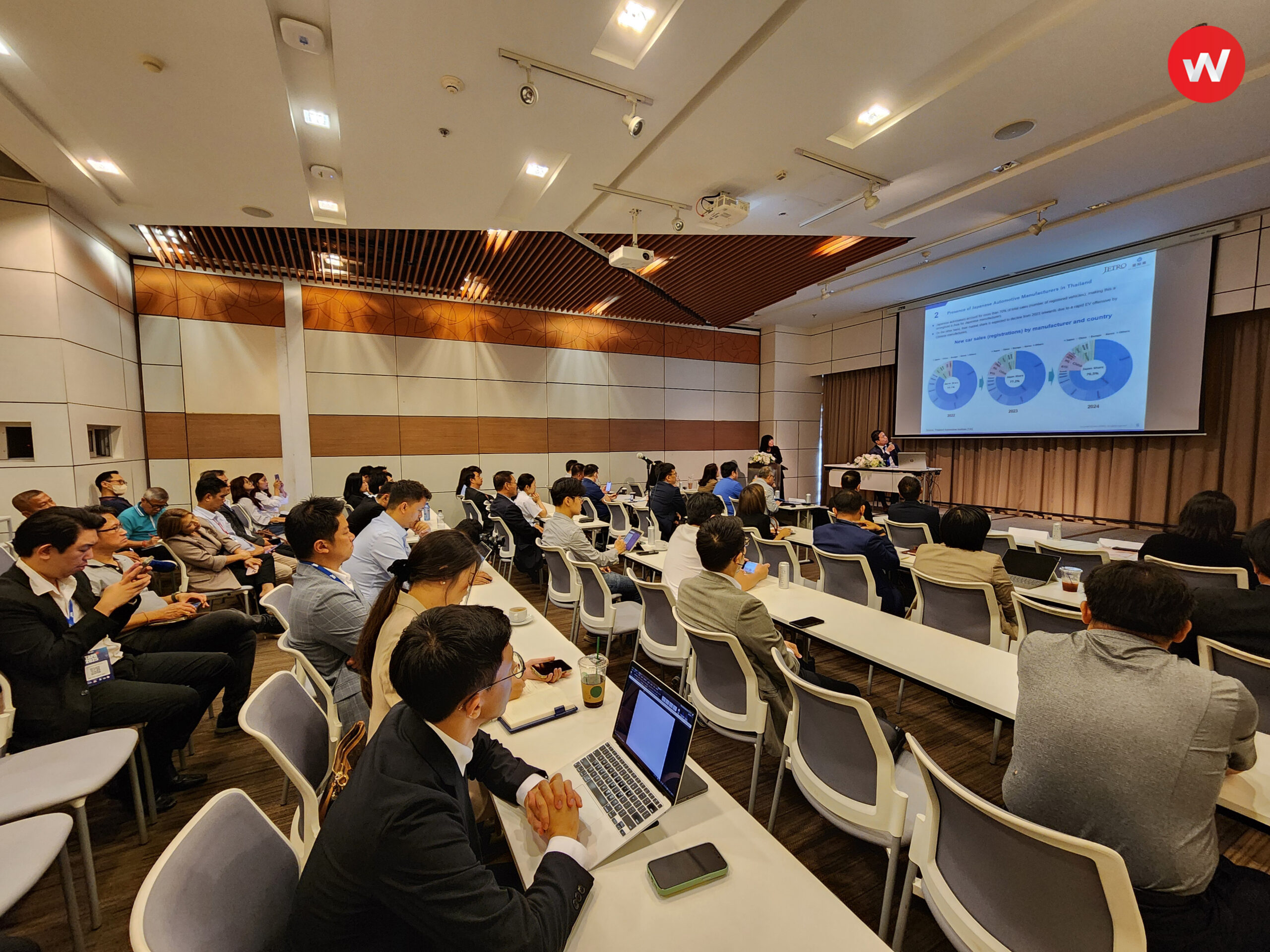 ในงานสัมมนา มีการนำเสนอภาพรวมสถานการณ์ของอุตสาหกรรมยานยนต์ในประเทศไทย โดยได้รับเกียรติจากคุณ Shinya Tsukada – Director of Aichi Office, JETRO Bangkok ซึ่งได้ให้ข้อมูลเชิงลึกเกี่ยวกับบทบาทของอุตสาหกรรมยานยนต์จากค่ายญี่ปุ่นที่มีส่วนสำคัญในการขับเคลื่อนเศรษฐกิจไทยมายาวนาน และชี้ให้เห็นถึงการเปลี่ยนแปลงที่เกิดขึ้นอย่างชัดเจนในช่วง 3 ปีที่ผ่านมา เมื่อกระแสของยานยนต์จากค่ายจีน โดยเฉพาะรถยนต์พลังงานไฟฟ้า (BEV) เริ่มเข้ามามีบทบาทมากขึ้นในตลาดไทย หากดูจากตัวเลขการจดทะเบียนรถในปี 2022 พบว่ารถจากค่ายญี่ปุ่นยังคงครองส่วนแบ่งสูงถึง 85% แต่ลดลงมาอยู่ที่ประมาณ 76% ในปี 2023 และ 2024 ซึ่งเป็นผลโดยตรงจากการเข้ามาของรถ BEV จากจีนและยุโรป ที่สามารถจำหน่ายในราคาถูกด้วยแรงจูงใจด้านสิทธิประโยชน์ทางภาษีจากภาครัฐไทย