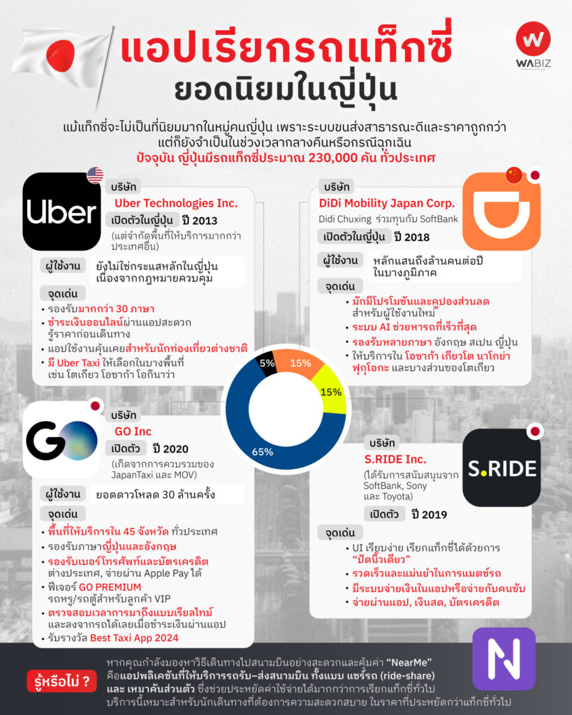 ปัจจุบันญี่ปุ่นมีแท็กซี่กว่า 230,000 คันทั่วประเทศ และยังมีแอปใหม่ ๆ เช่น NearMe ที่รวมบริการแชร์รถ–ส่งสนามบิน–ขนส่งสินค้าไว้ในแพลตฟอร์มเดียว