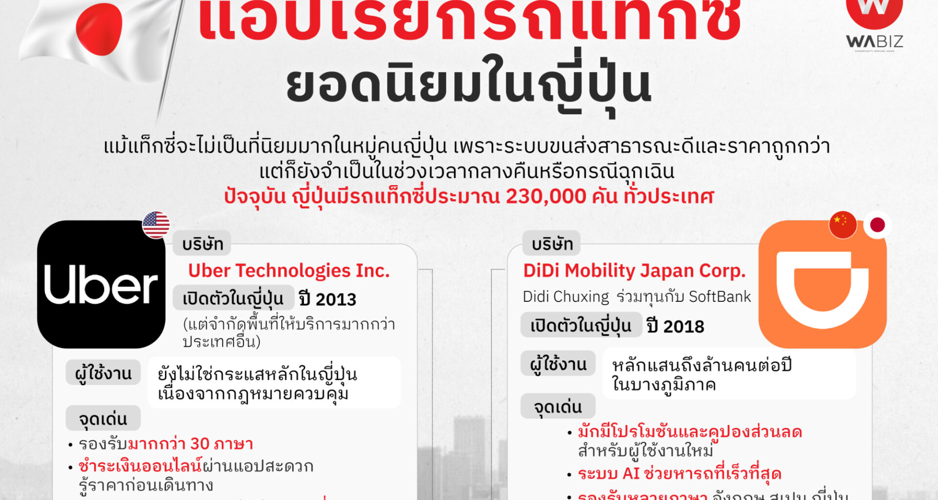 ในญี่ปุ่น แม้ระบบขนส่งมวลชนจะดีมากอยู่แล้ว แต่ช่วงดึกหรือเวลาเดินทางต่างเมือง “แอปเรียกรถโดยสาร (Ride-hailing app) หรือ “บริการเรียกรถผ่านแอป” ก็ยังได้รับความนิยมเพิ่มขึ้นเรื่อย ๆ โดยเฉพาะ GO Inc. ที่เกิดจากการรวมตัวของ JapanTaxi และ MOV ปัจจุบันมีส่วนแบ่งตลาดสูงถึง 65%